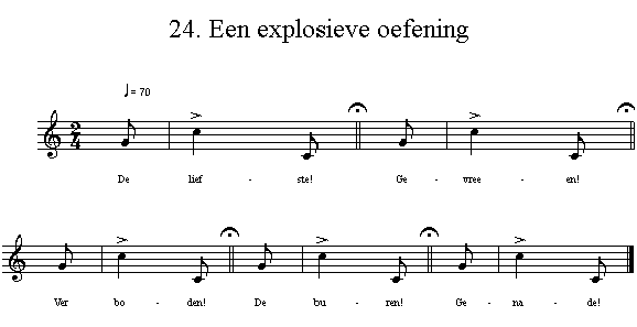 oefening 24 Blaas uit. Wacht tot je lucht nodig hebt, hap snel een beetje lucht en roep/zing twee maten. Ontspan bij elke fermate voor de volgende adem. Laat de stomme e’s ontspannen klinken als de uh… in een spreekpauze. Delen: Klik om te delen op X (Opent in een nieuw venster) X Klik om te delen op Facebook (Opent in een nieuw venster) Facebook Vind-ik-leuk Aan het laden...